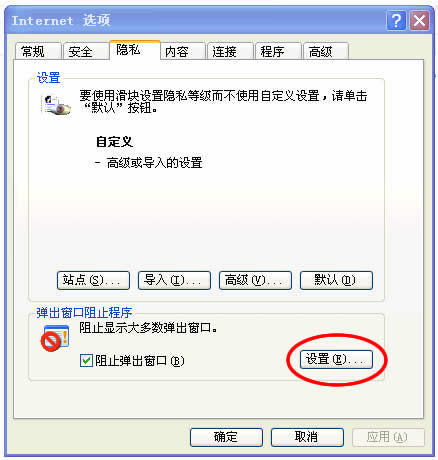 | 2、在弹出窗口阻止程序那里点击设置(如上图红圈区); |